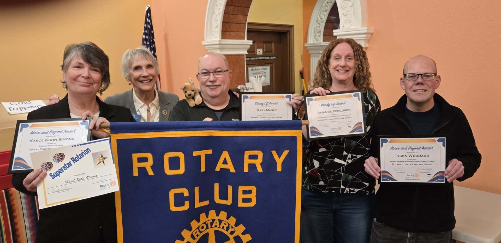 Several of the members received service awards at the meeting. From left, President Karol Kuhn Simons, me, Gary Manly, Amanda…