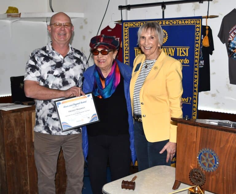 I arrived early for Rotary lunch on Friday, and half the members were already there. Heddy Radkey was the first to welcome me with a smile, a handshake, and a hug. After the traditional ringing of the bell and opening announcements, President Larry Langenberg asked me to present Heddy an award for her “Above and Beyond” service. She was so surprised!